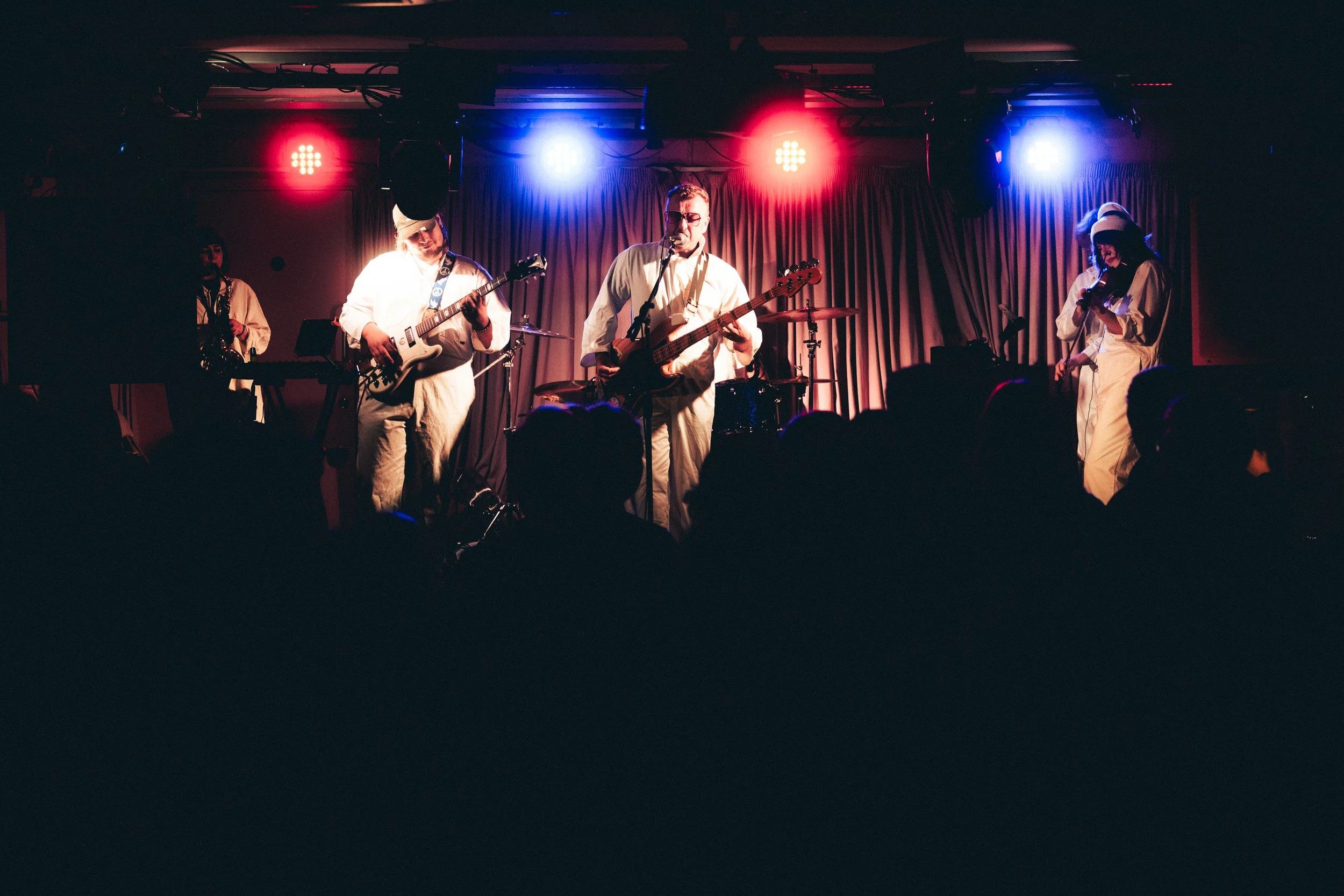A decisive departure that sets the coordinates for uncharted new destinations, it may come as little surprise that a shake-up of Hello Cosmos’ core crew can be attributed to ‘Come Out Tonight’”s auxiliary thrust of sounds. While Ben (vox/guitars), Simon (drums), and Angela (strings/synths) remain very much in the cockpit; the collective are now joined by a new crop of full-time cosmonauts including bassist/percussionist Isaac “Dobbo” Dobson and guitarist Alex Beston of Vacant Weekend (who both joined the official live set up from 2024), sax/synth whizz Frankie Pigeon (Dilettante/BC Camplight), and harmonica player Oli Brown (of Herelduke, who also notably produced Hello Cosmos’ ‘Golden Dirt’ mixtape). Longtime fans of the collective will undoubtedly note the playing of guitarist Adrian Ingham (Deathretro) still featuring prominently across the record too.